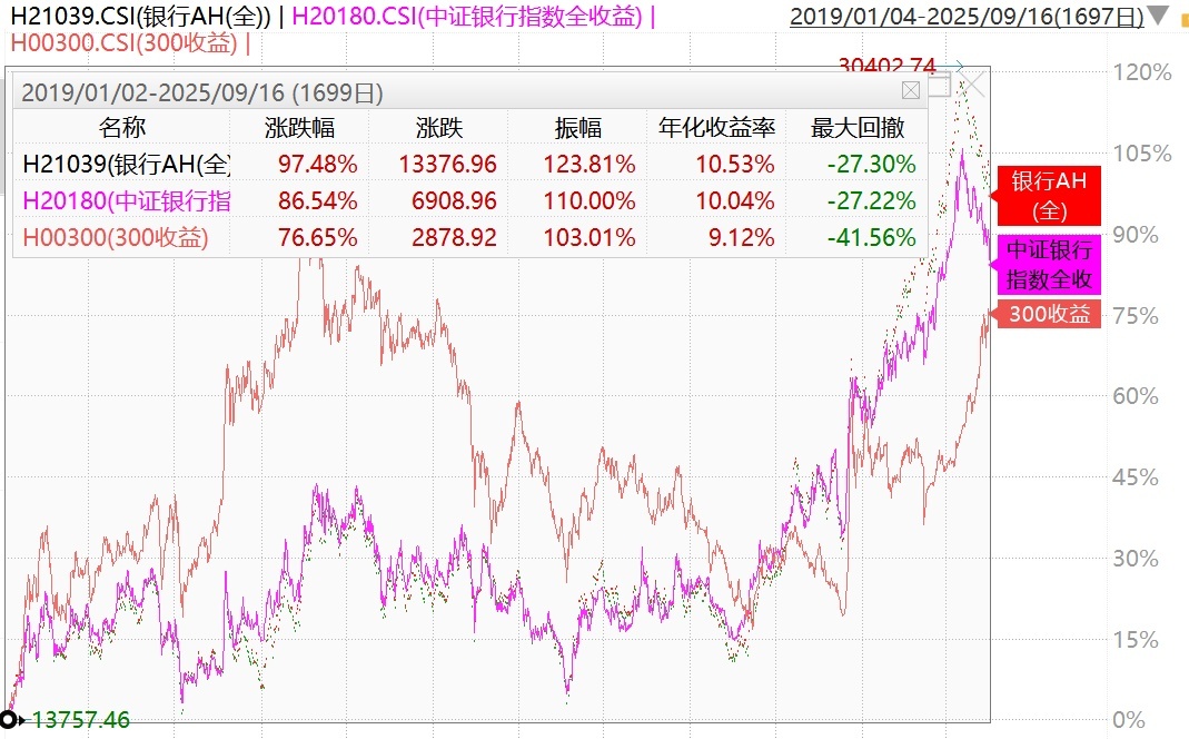 2019年以来至9月16日,银行AH全收益指数累计涨幅97.48%,跑赢中证银行全收益指数超10%,跑赢沪深300全收益20.83%。