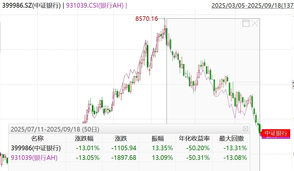 截至发稿,7月11日以来,银行AH指数、中证银行指数跌幅均超过13%,银行板块时隔一年再度跌破120日均线。